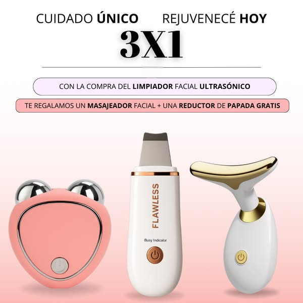 Con la compra de tu Limpiador Facial Ultrasónico, te llevas de regalo un Masajeador Facial con Microcorriente y un Reductor de Papada.
